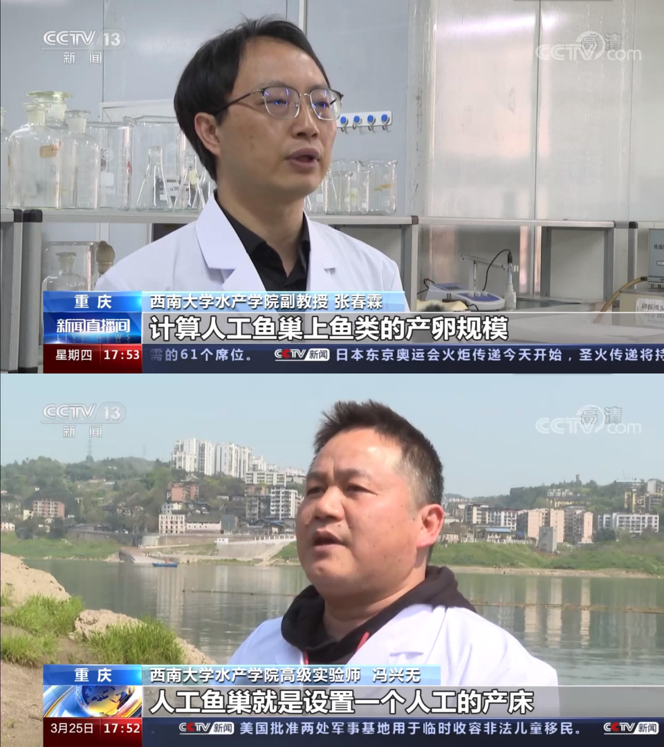 近日,中央电视台《新闻直播间》《朝闻天下》《正点财经》等多个栏目报道学校铺设人工鱼巢以进一步增加嘉陵江天然鱼类资源、改善水域生态环境的相关工作。水产学院张春霖、冯兴无两位老师接受央视采访,对人工鱼巢原理、作用及开展的相关研究等情况做了介绍。