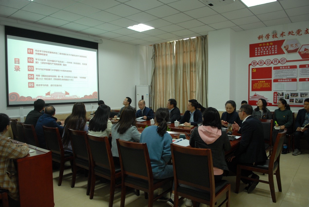 活动中,党支部首先传达学校党委和机关党委关于开展党史学习教育的有关精神和要求,党员同志们一起扎实学习习近平《论中国共产党历史》一书中的《知史爱党,知史爱国》《讲好中国共产党的故事》篇目和习近平总书记致厦门大学建校100周年的贺信,集中观看《典故后面有故事》第一集《80多年口口相传“半条棉被”暖人心》和纪录片《焦裕禄生命的最后53天》。支部党员结合学习内容,展开讨论和交流。支部书记黄斌为全体党员讲授一堂题为《从百年历史看党的初心和使命》的微党课,并汇报2021年度支部党建工作计划。