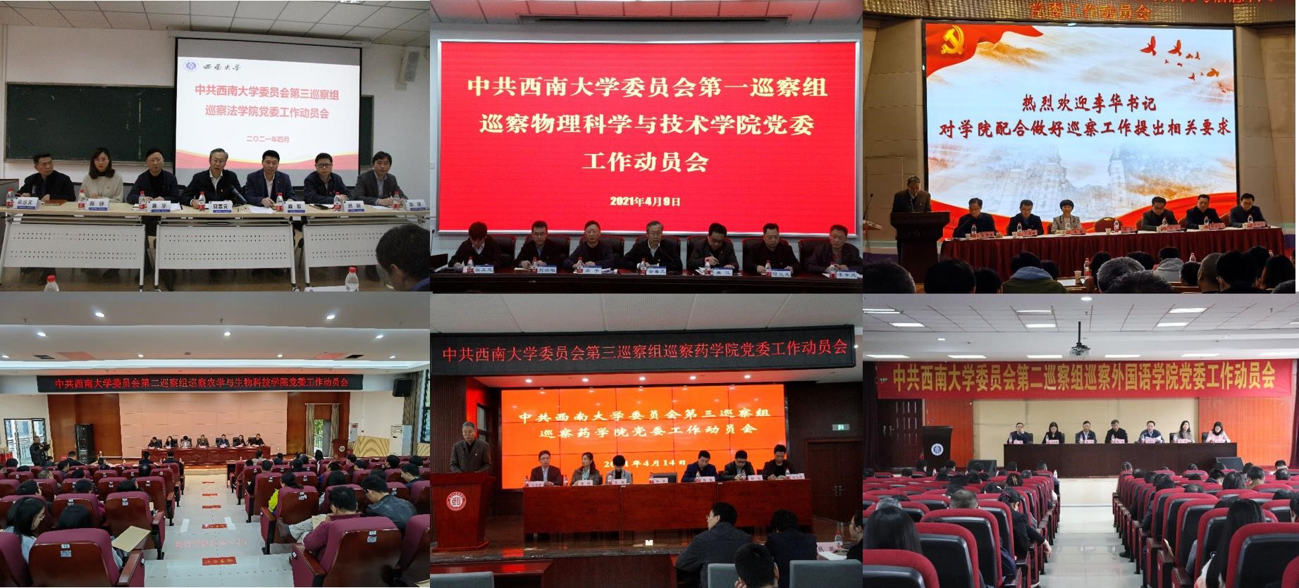 按照学校党委关于巡察工作统一部署和总体安排,4月9日至14日,学校党委第六轮巡察组分别进驻法学院党委、物理科学与技术学院党委、计算机与信息科学学院党委、农学与生物科技学院党委、外国语学院党委、药学院党委等6个被巡察单位,并组织召开巡察工作动员会。党委副书记、巡察工作领导小组副组长安春元,党委副书记、纪委书记、巡察工作领导小组副组长李华,党委副书记潘洵分别出席有关单位动员会并讲话。