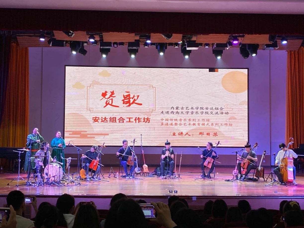 当天下午,安达组合队长、内蒙古艺术学院教授、中国音乐学院客座教授那日苏,带领成员琪琪格玛、毕力格巴特尔、乌日根、乌尼、青格乐、赛汗尼亚、阿乌日根、青格勒图在音乐学院大演奏厅就中华传统音乐创造性转化、创新性发展进行交流。