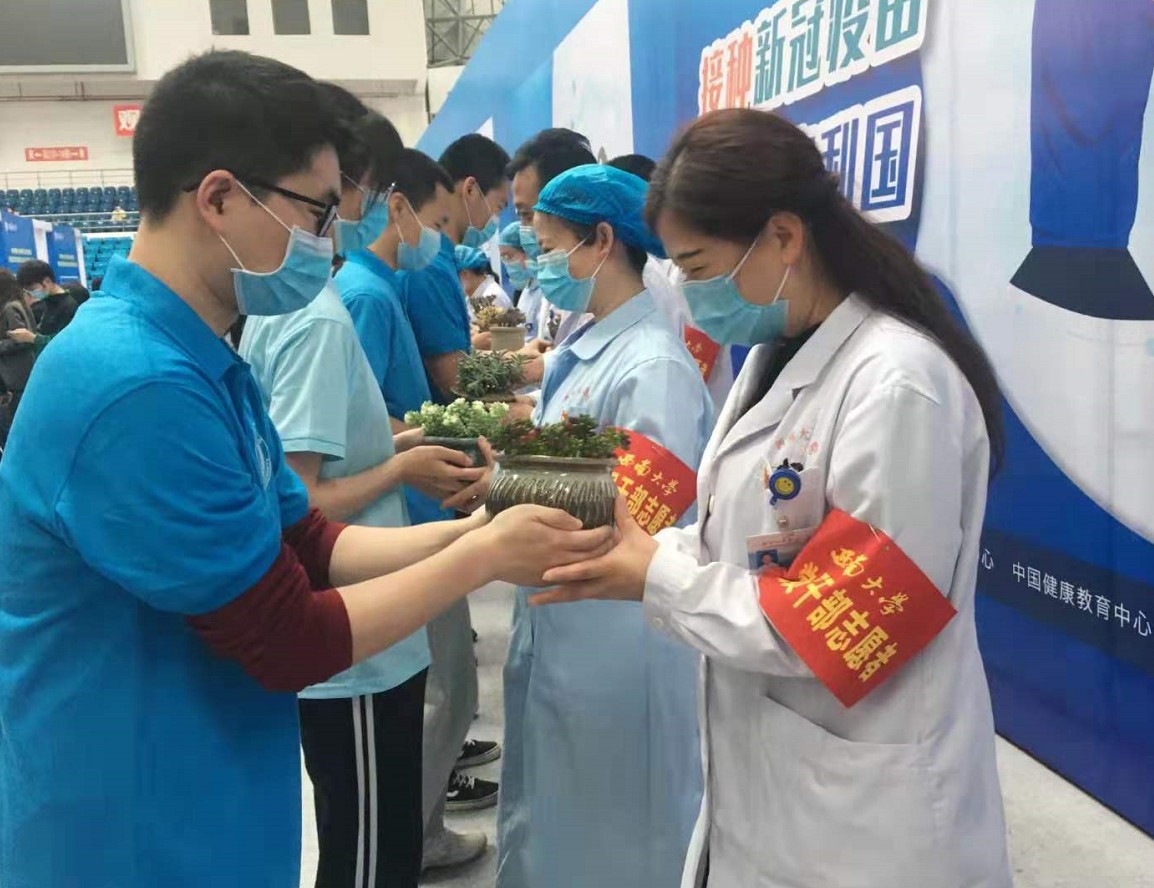 4月22日下午,本次接种接近尾声时,在taptap点点官方网站中心体育馆上演了温馨一幕,农学相关专业同学和志愿者们为众多医务人员送上自己栽种的花苗与温暖的拥抱,每个人脸上都露出幸福的笑容,画面温馨十足,几天的辛苦疲劳都在爱中慢慢消除。