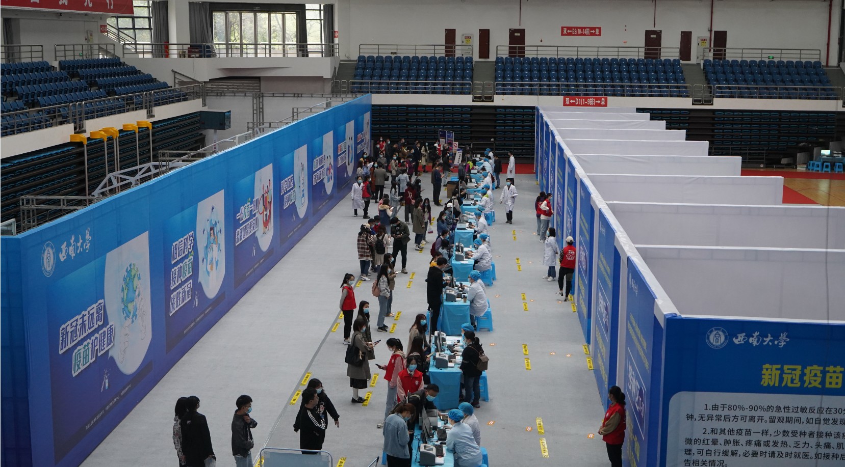 此次新冠疫苗接种工作由校医院牵头组织,接种场地充分利用学校中心体育馆,在入口处设置新冠疫苗接种流程图及新冠疫苗科普知识,让同学们在接种前提前了解新冠疫苗接种注意事项;集中接种点的布置,秉持着“单循环、不走回头路”的原则,科学合理规划了等候区、信息登记区、接种区、留观区、巡回观察点、AEFI处置区、医疗废物区、后勤保障区、疫苗管理区等工作区域,各个区域标识清晰明白,重要岗位都安排有医务人员和志愿者引导服务。其中,设置18个信息登记区及18个接种区,留观区能容纳五六百人同时留观。