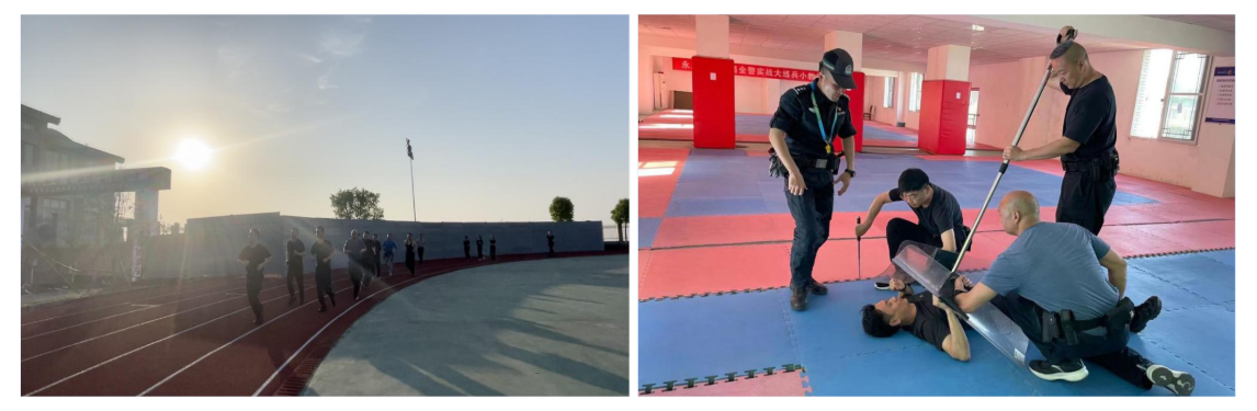 日训强本领:在连日密集的实训课程中,受训职工不仅学习了徒手制止技术、警械制止技术和防暴处突基础战术等基本技能,还结合高校安保工作特点,开展了拦阻队形、防护队形阻拦人群冲击以及模拟开阔地带协同使用警械对高危持械人员进行制止和现场控制的演练。