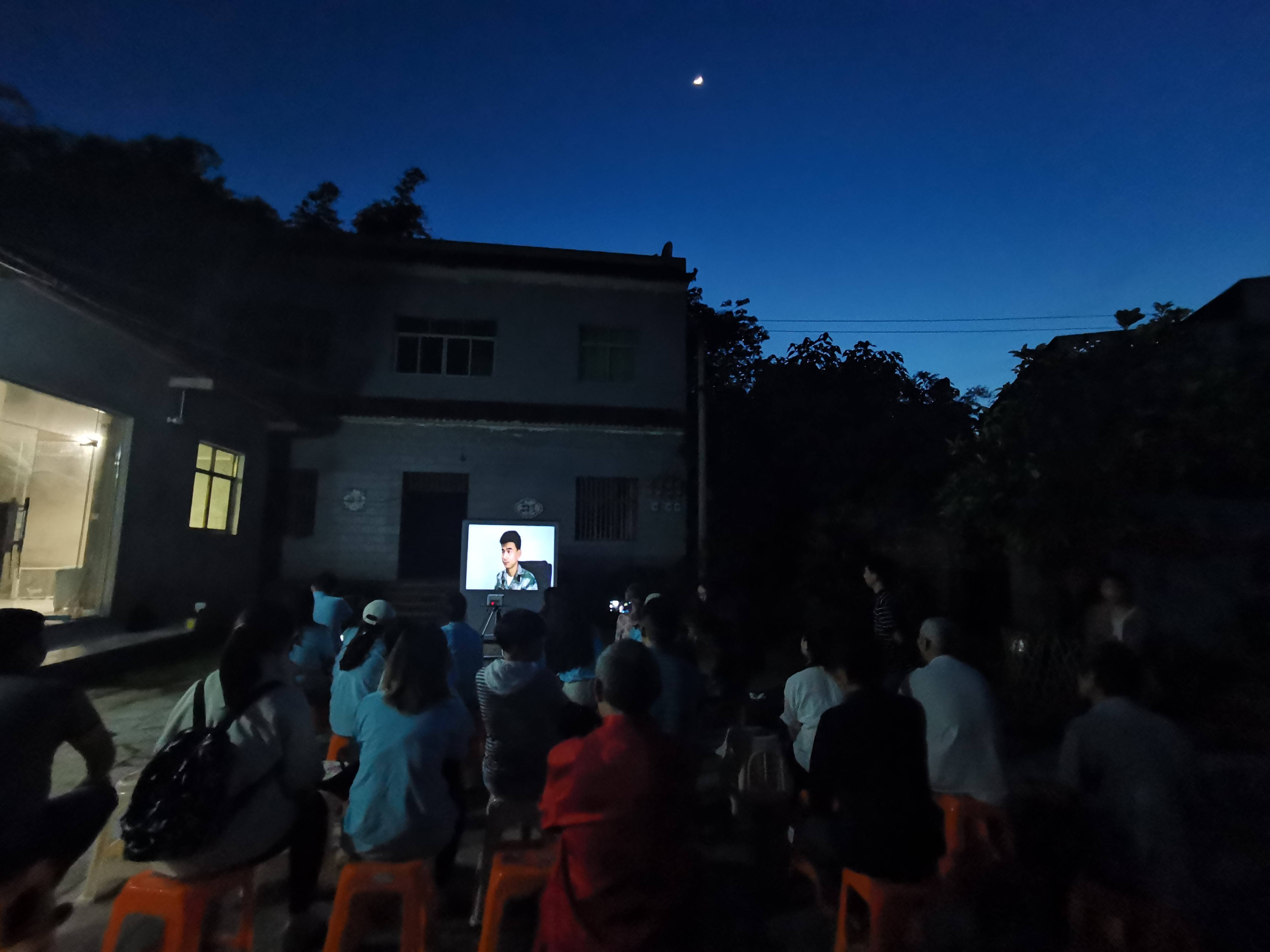 在村民院坝,研究生党员们为村民播放“看中国·外国青年影像计划·重庆行”优秀影片--《柱国之础》《荷波》《天路之路》和《先曼家园》,拍摄村民全家福,记录乡村巨变,记住美丽乡愁。