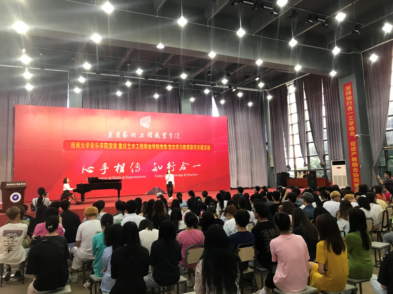 参观结束后,研学团赶往重庆艺术工程职业学院开展联学共建活动。先在该校图书馆报告厅举行了“我心中的歌”红色经典歌曲推介分享活动,师生们用讲述与演唱相结合的方式,分享对《红梅赞》《绣红旗》《沂蒙颂》《长城谣》《珊瑚颂》《我的祖国》等经典歌曲的学习感悟,并现场进行深情演绎,激起连连掌声,让现场师生深深感受到红色经典震撼心灵的力量。