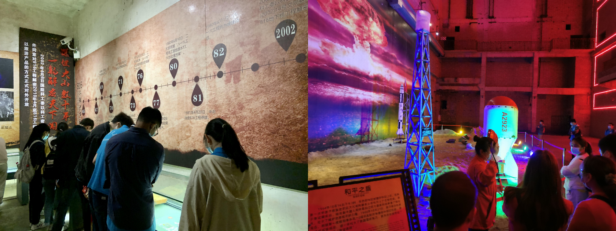 在历时一个半小时的参观过程中,全体党员耐心地听着讲解员对816核工程内部构造声情并茂的介绍,逐一参观了104核发电厂房、9号引水洞、101反应堆主厂房、核废料处理场、反应大锅、仪表室等地点,身历其境地感受着当时核基地建设者们不怕困难、勇于牺牲的英勇事迹。兼顾生产和发电两大功用的规划,冬暖夏凉、四季恒温的巧妙设计,控制室内密密麻麻的仪表、操控台上至今闪闪发亮的仪器部件都彰显着当时建设者的敬业和智慧。核基地展区出口处陈列着的一幅幅珍贵照片,真实再现了当时建设核基地艰苦的工作环境,也让大家认识了一个个为了国家利益而献身的英雄。