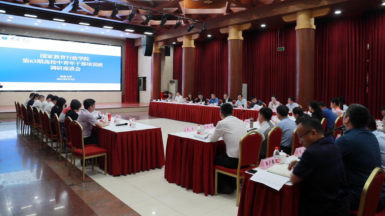 6月4日,国家教育行政学院第63期高校中青年干部培训班重庆调研团(以下简称中青班)一行来校调研交流。学校与中青班双方在东方红会议厅举行座谈,副校长陈时见出席座谈会,学校相关单位负责人参加会议。会议由党政办公室主任黄杰主持。