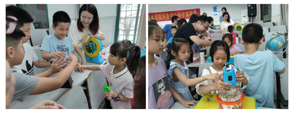 7月10日,taptap点点官方网站物理科学与技术学院举办了两场“科学魔术秀”主题科普体验营,吸引了近200名小学生报名参加。科学体验营分为动手实验、科学魔术秀和科普展品体验等三大类共30余项子活动。在大学生志愿者耐心指导下,小朋友们利用两个小纸杯及一根橡皮筋,自制了纸杯飞行器,初步了解伯努利原理,体会空气动力学的魅力。在科普展品体验环节,小朋友一口气体验了“走马灯” “饮水鸟” “希罗喷泉” “三角支撑”“电磁小火车” “简易电动机” “手触亮灯” “手摇风扇” “穿墙而过” “看得见的声音” “辉光球” “抓虫子” “时光隧道” “电磁炮” “无线充电” “无线电报” “蓝牙音箱” “红外测温仪” “红外传感灯” “范式起电机”等近30项科普实验作品。教授演示、大学生指导、自己制作,这新奇的科学体验,让参与的小朋友和旁观的家长都大呼过瘾,意犹未尽。