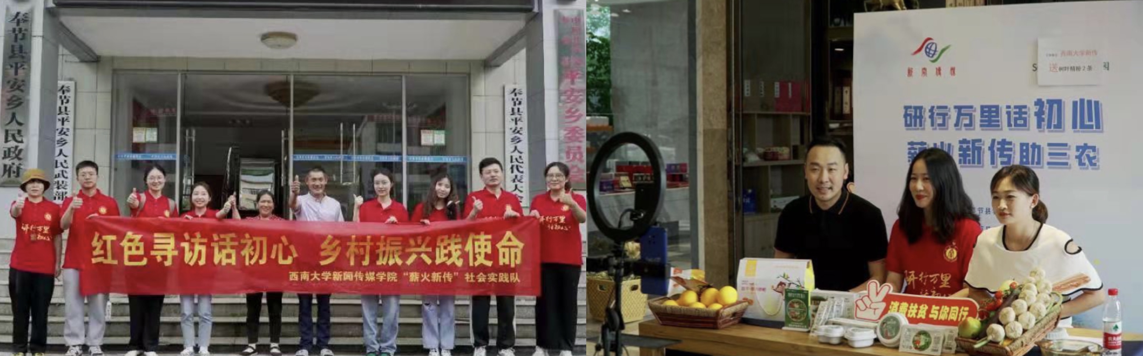 直播带货助三农,实践锻炼长才干。为助力奉节县平安乡特色产业发展,新传学子发挥专业特长,组织开展公益助农直播带货活动。队员们主动联系奉节县农委、乡村振兴局等部门,深入乡村企业和种植基地进行实地调研,亲身参与产品制作,详细了解卖品,拍摄宣传视频,做好活动预热。直播当天,队员们联系奉节县网红助农主播共同参与特色农产品直播推广,累计实现点赞6万余次。直播结束后,队员们还参观奉节县青年创新创业促进中心、奉节县网络扶贫直播服务中心,调研学习全媒体环境下农业农村发展新态势,思考探索乡村振兴新路径。