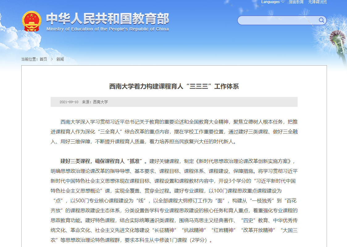 近日,学校着力构建课程育人“三三三”工作体系受到教育部网站报道,相关内容由教务处、党政办公室报送。教育部网站报道原文如下: