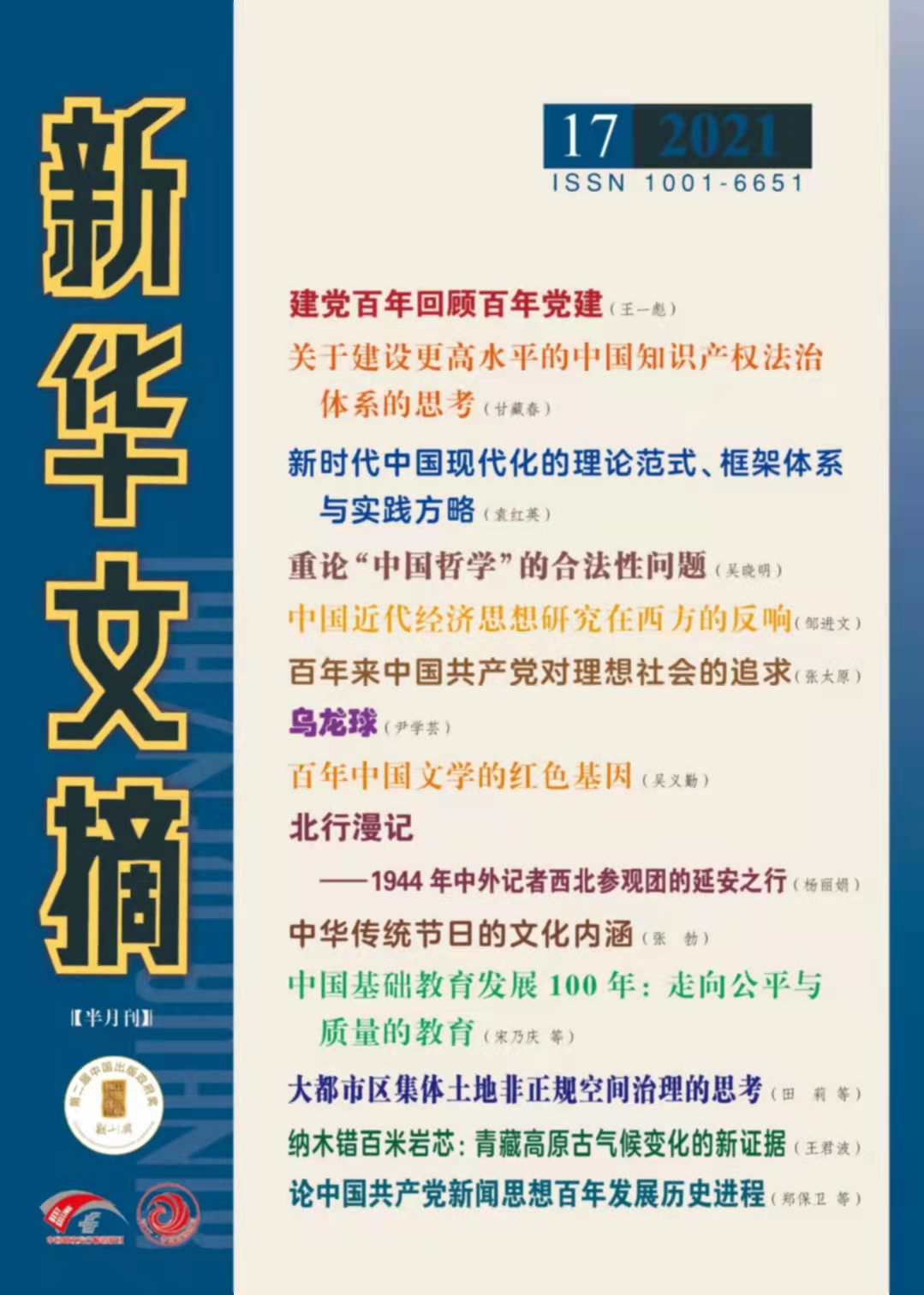 为多角度反映中国共产党百年经验、百年成就、百年创举,《taptap点点官方网站学报(社会科学版)》精心策划和刊发建党百年系列文章15篇,其中宋乃庆教授撰写的《中国基础教育发展100年:走向公平与质量的教育》一文,被《新华文摘》2021年第17期全文转载,并作为封面文章进行推荐,引起较大社会反响。