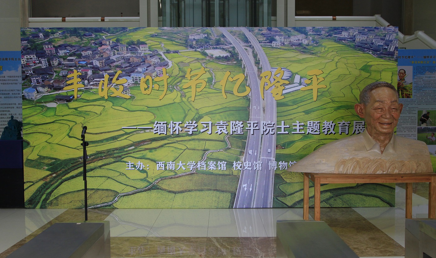 郑劲松介绍,除人们敬献的这些卡片和实物外,还收集了数百张档案、资料照片、报刊文章和袁隆平给母校的各种题字题词等手稿照片,系统地追溯了袁隆平的生平事迹与伟大成就、杂交水稻的攻关历程、袁隆平历次回母校的难忘瞬间和袁老去世后人们自发悼念的感人场景以及学校师生创作的怀念文章。此外,不久前,在当年袁隆平大三参加“土改”工作的大足区拾万镇,袁老亲自关心支持下试种的15亩巨型稻获得成功。档案馆工作人员专门前往大足拾万镇稻田取回的4株巨型稻标本,也在此间展出。“禾下乘凉,梦想成真,稻香时节,我们倍加思念和缅怀袁隆平学长。”农学与生物科技学院研究生陈新龙看着已经发黄的巨型稻株说。