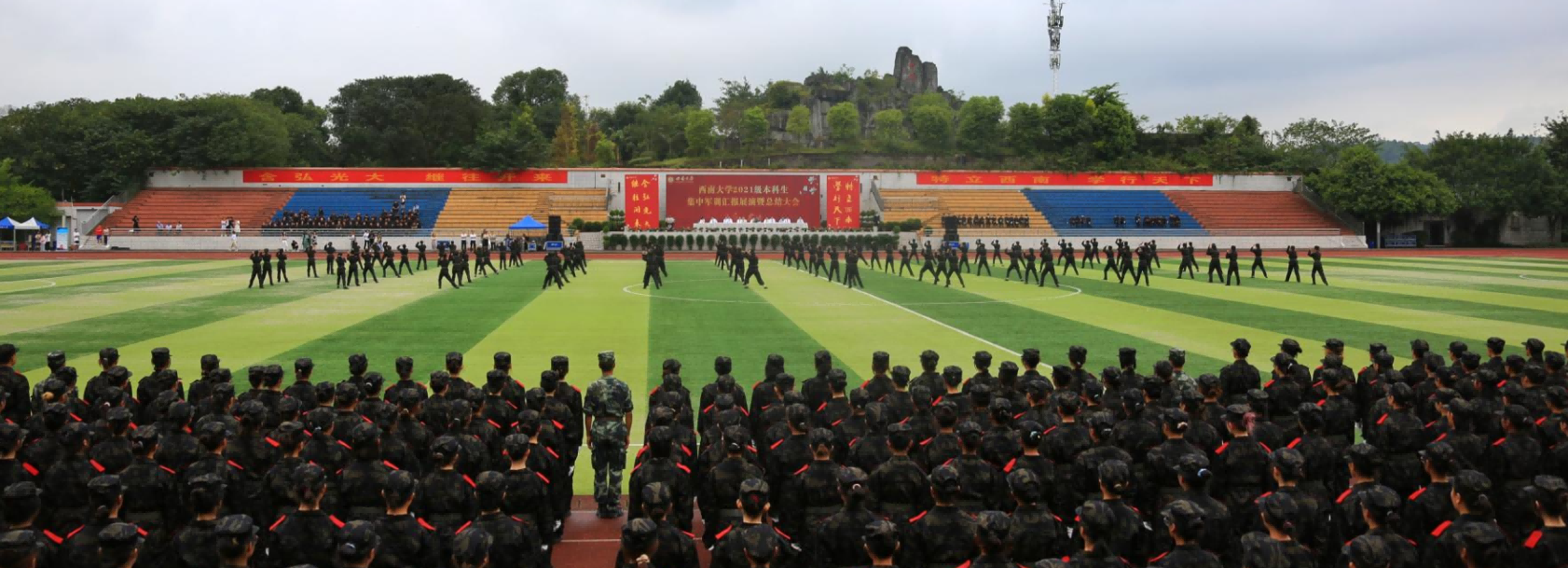 拳拳报国志,沙场秋点兵。9月27日上午,学校2021级本科生军训汇报展演暨总结大会在北碚校区第一运动场和荣昌校区运动场同步举行。校长、军训领导小组组长、军训师师长张卫国,学校党委副书记安春元,学校党委副书记、军训领导小组副组长、军训师副政委潘洵出席活动,军训领导小组成员单位,承训部队全体教导员、各学院(部)参训干部,2021级全体本科生参加。