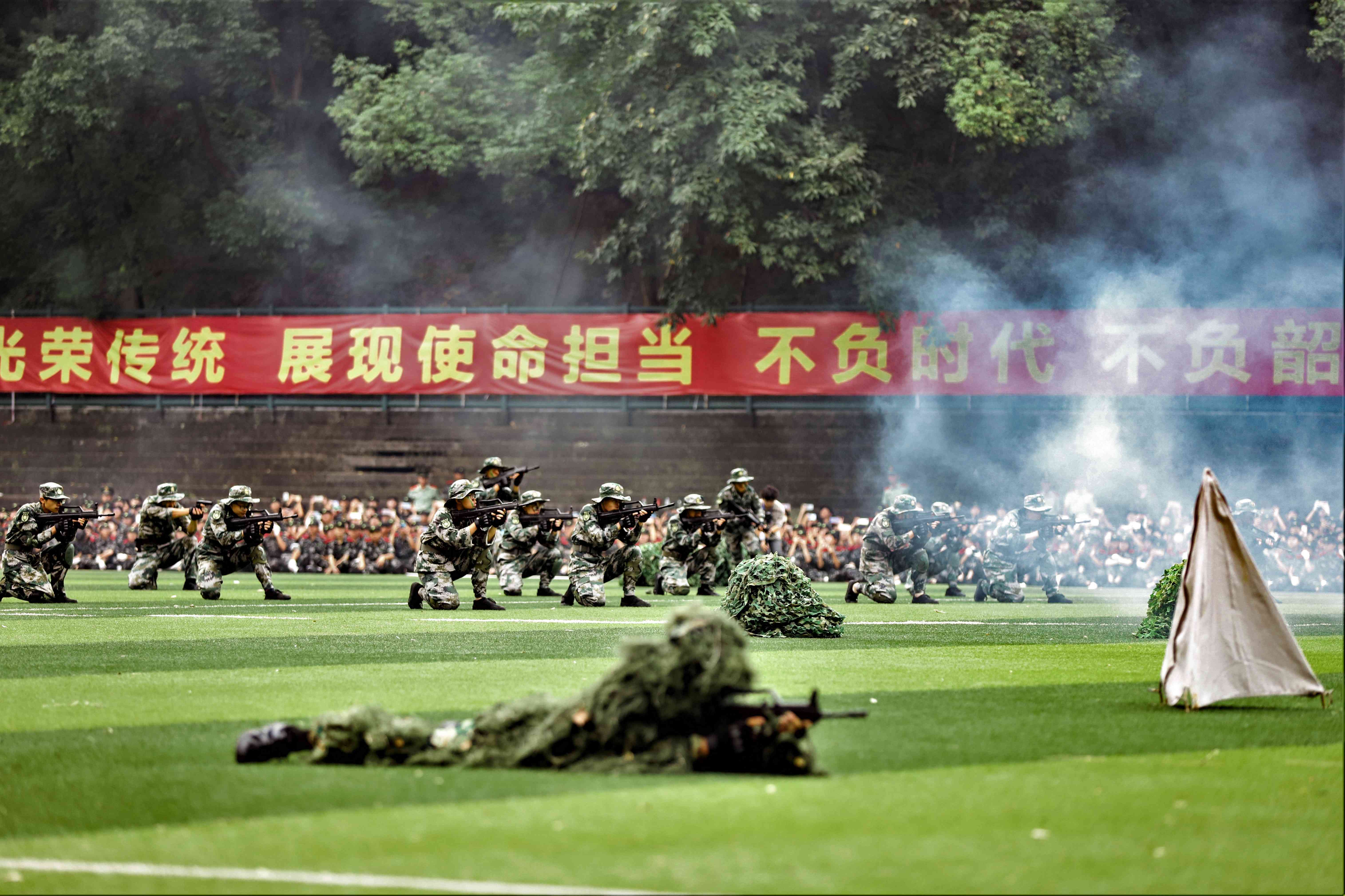 据悉,学校2021级本科生军训从2021年9月13日起,通过分散军训和集中军训两个阶段,按照全员参与、阶段推进、学练结合、基础实用的原则有序组织开展。集中军训阶段,10000余名参训学员全员参与、刻苦训练,认真开展队列动作、分列式、特种战术、心理健康操等科目训练,并认真开展国防教育、人民防空教育、部队光荣传统教育等科目的线上学习活动。在全学年内,学校还将陆续开展内务卫生整理、早操出勤训练、消防技能训练、自救互救训练、考核比武等学习实践活动。帮助新生培养良好学习生活习惯,掌握各项应急技能。