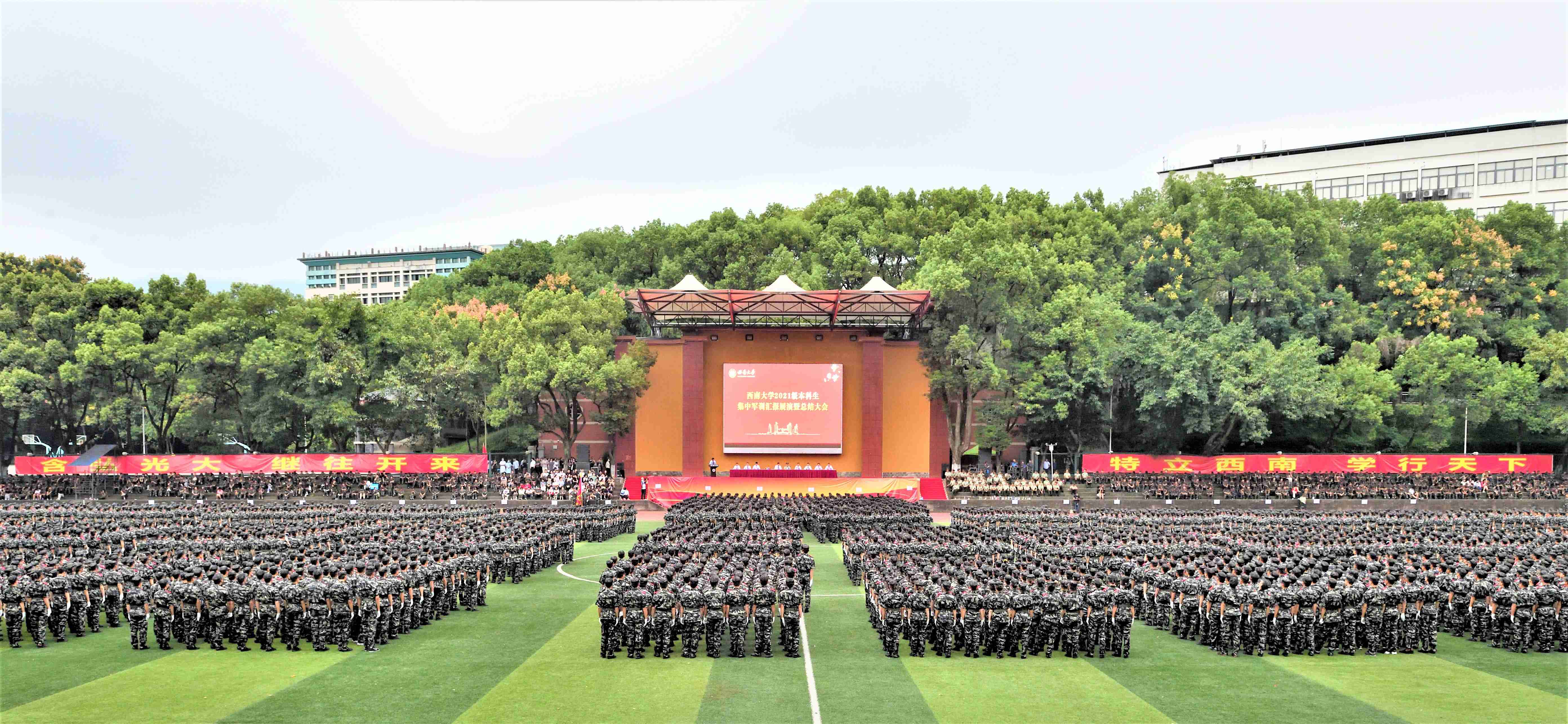 在雄壮的国歌声中,军训汇报展演暨总结大会正式开始。随着倒计时队形结束,方阵迅速变换出校训“含弘光大,继往开来”、大学精神“特立西南、学行天下”的字样,“赓续红色血脉,贡献青春力量,请党放心,强国有我!”的响亮口号振奋全场。由各学院(部)连队组成的36个方阵迈着整齐的步伐,依次走过主席台接受检阅。