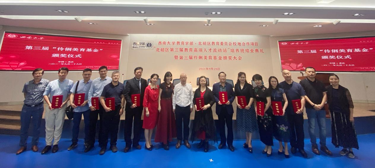 出席颁奖仪式的嘉宾有重庆市北碚区教育委员会主任杨平、重庆市北碚区进修院院长饶英,学校党委副书记安春元、教育学部宋乃庆教授。学校教育学部、外联络办公室负责人,伶俐美育基金获奖个人、机构代表及北碚区高端人才流动站教师代表和学生代表参加颁奖仪式。