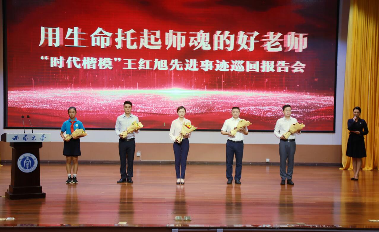 10月8日下午,“用生命托起师魂的好老师”——“时代楷模”王红旭同志先进事迹巡回报告会在学校音乐学院演奏厅举行。市教委二级巡视员刘先海,北碚区一级巡视员、区委宣传部部长江绪容,相关校领导以及市委宣传部、市教委、北碚区委宣传部相关人员等出席报告会,相关职能部门负责人、师生代表等聆听报告。