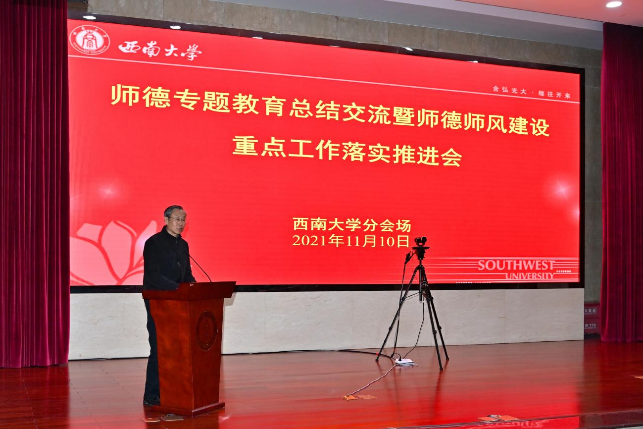 与会同志首先集中参加师德专题教育总结交流暨师德师风建设重点工作落实推进视频会议。视频会议结合落实中央巡视整改任务,进一步部署推进教师思想政治和师德师风建设工作。教育部党组成员、副部长孙尧指出,教育部将2021年确定为“高校教师思想政治工作强化年”,不断加强教师思想政治和师德师风建设。今年5月师德专题教育开展以来,各地各校将师德专题教育与党史学习教育紧密结合,在教师思想政治建设上实现新提升,在规范教师职业行为上取得新进展,在融入教育教学实践中抓出新成效。下一步要继续巩固师德专题教育成效,持续深化拓展教育成果,及时转化运用到教师队伍建设和教育高质量发展中。