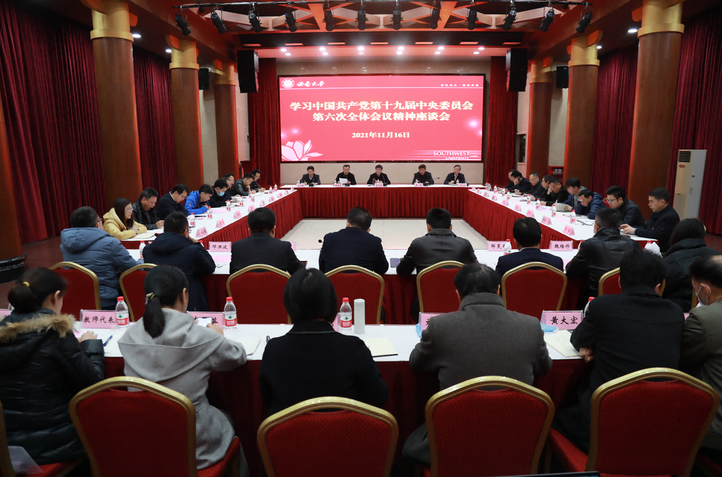 为深入学习贯彻党的十九届六中全会精神,推动全会精神学习和研究阐释深入开展,11月16日上午,学校在东方红会议厅召开学习中国共产党第十九届中央委员会第六次全体会议精神座谈会。学校党委书记李旭锋、党委副书记潘洵出席会议,职能部门负责人代表、学院(部)负责人代表、师生代表参会,会议由李旭锋主持。