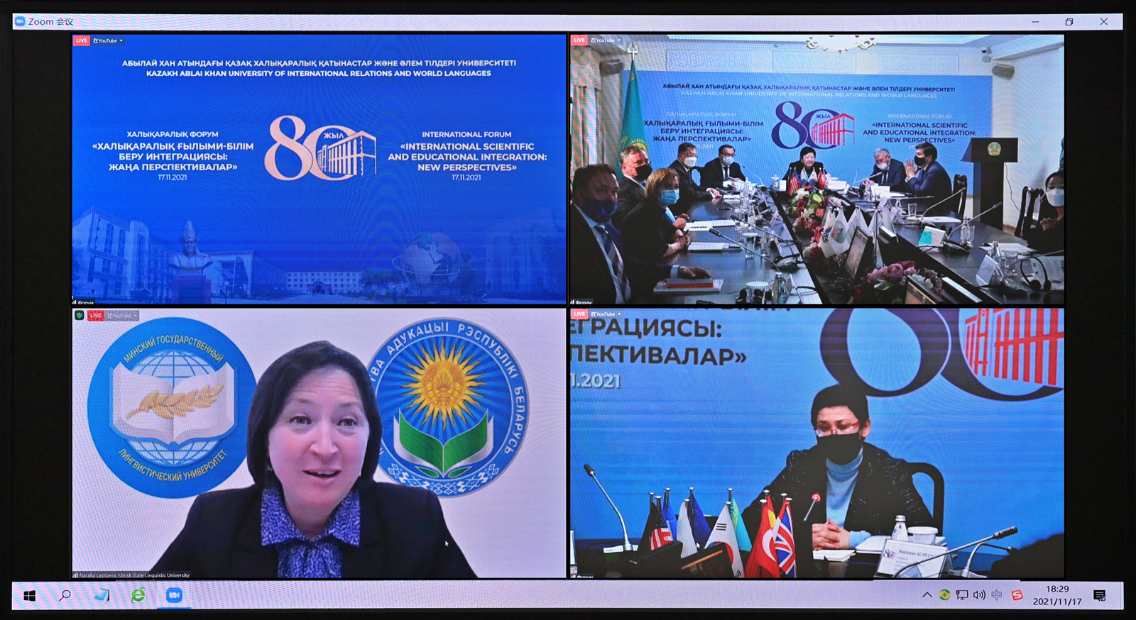 11月17日,校长张卫国受邀参加学校国际友校——哈萨克斯坦阿布莱汗国际关系与外国语大学建校八十周年线上庆典活动,并在大会上致辞。学校国际合作与交流处、教育学部、外国语学院、国际学院等单位相关负责人和孔子学院中方院长陪同参加庆典。