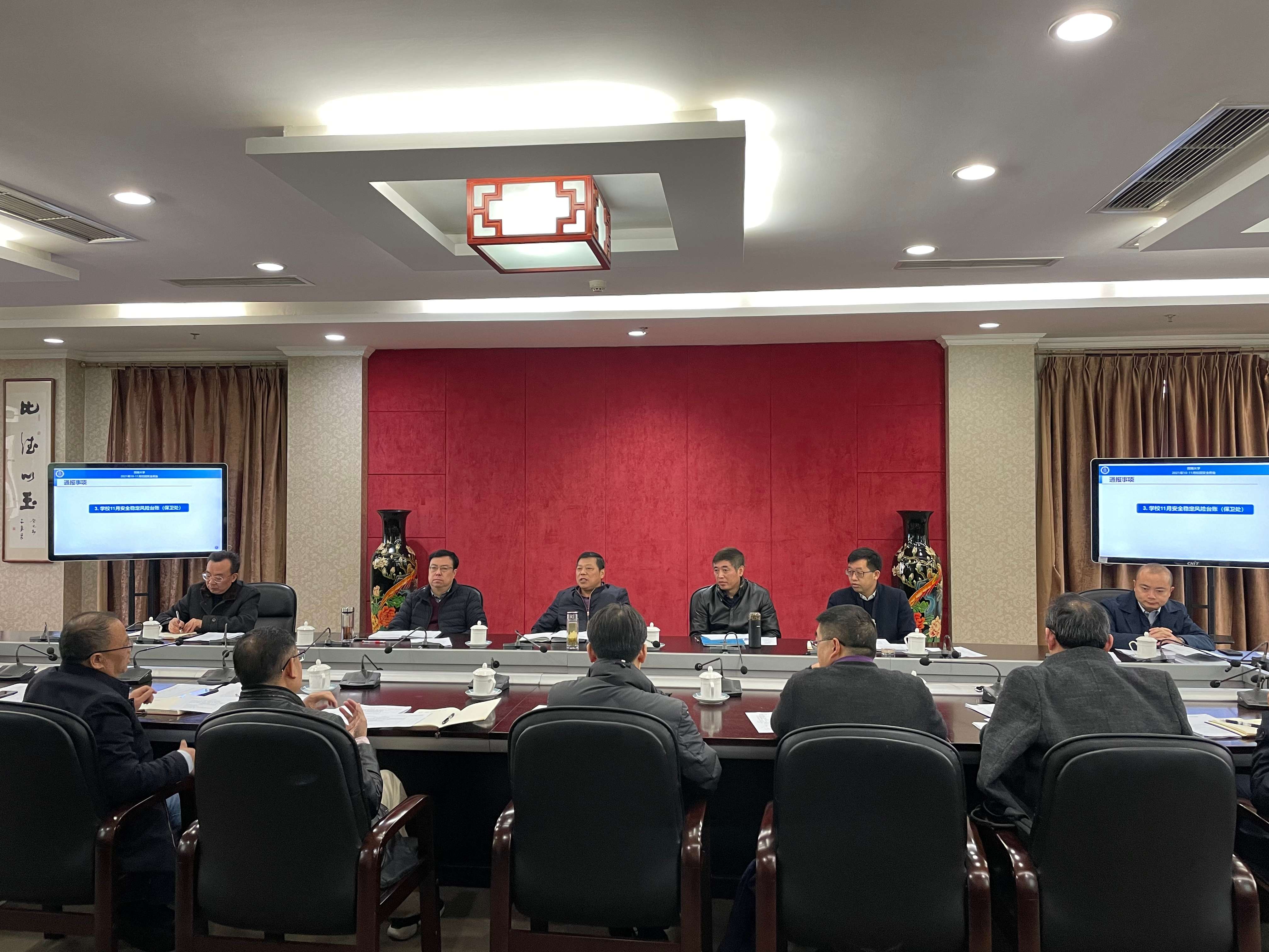 保卫处、实验室建设与设备管理处、信息化建设办公室分别通报学校10-11月安全稳定风险台账、9月校园安全例会研究事项推进落实情况、新药化大楼实验室重大技术安全隐患、信息系统账号弱密码整改工作等情况。与会人员就通报事项进行研究讨论,明确整改责任单位,细化整治措施,坚决做到“把风险防控挺在隐患前边、把隐患排查治理挺在事故前面”,防止安全事故发生。