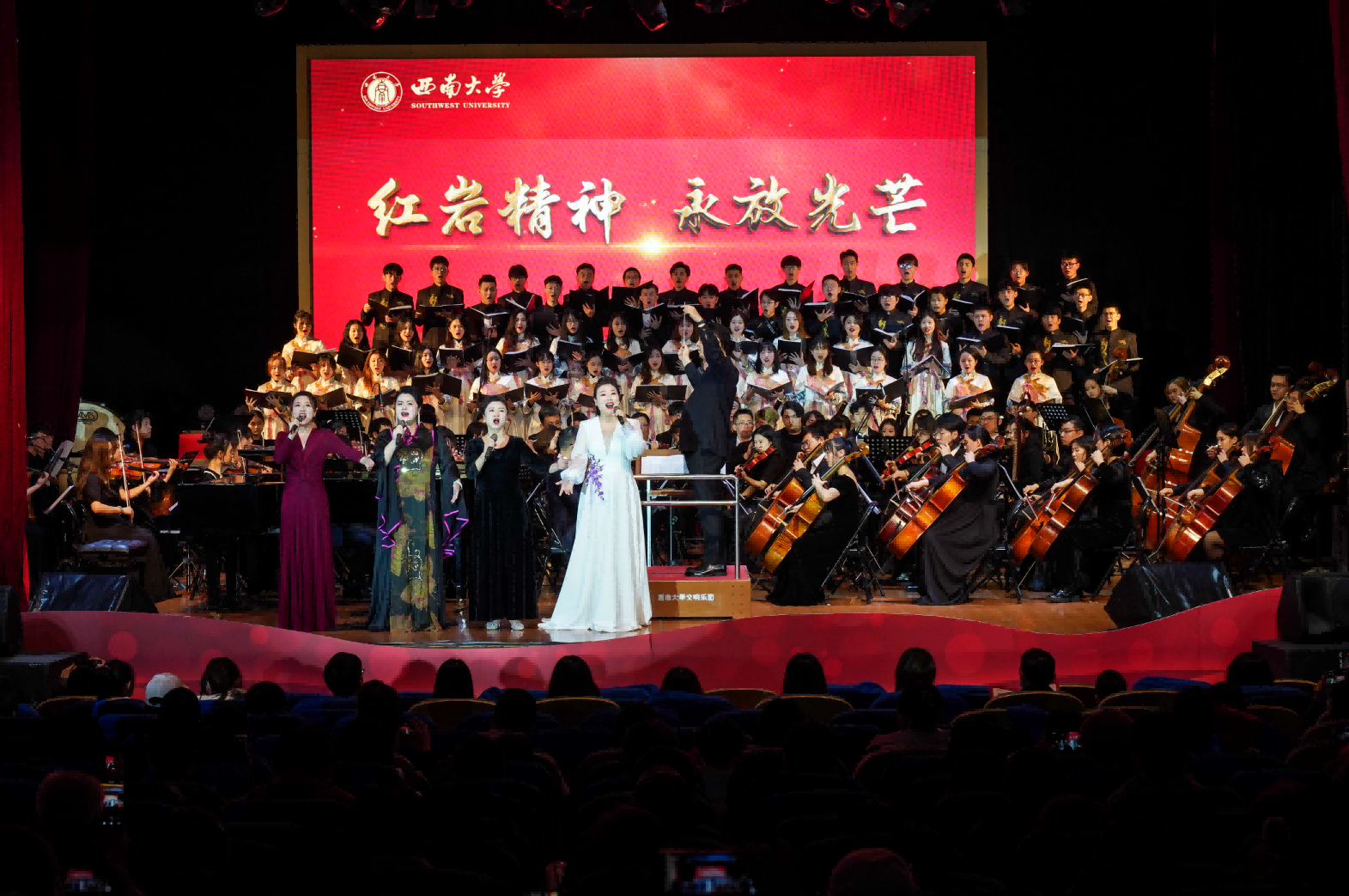 红岩精神光照千秋,峥嵘岁月辉映未来。11月29日晚,由学校党委主办,学校党委宣传部、党委网络工作部、音乐学院党委承办的“红岩精神 永放光芒”音乐党史展演活动在光大礼堂拉开帷幕,学校党委副书记潘洵,党委常委、党委宣传部、党委网络工作部部长李荣华出席展演,全校师生代表800余人观看演出。