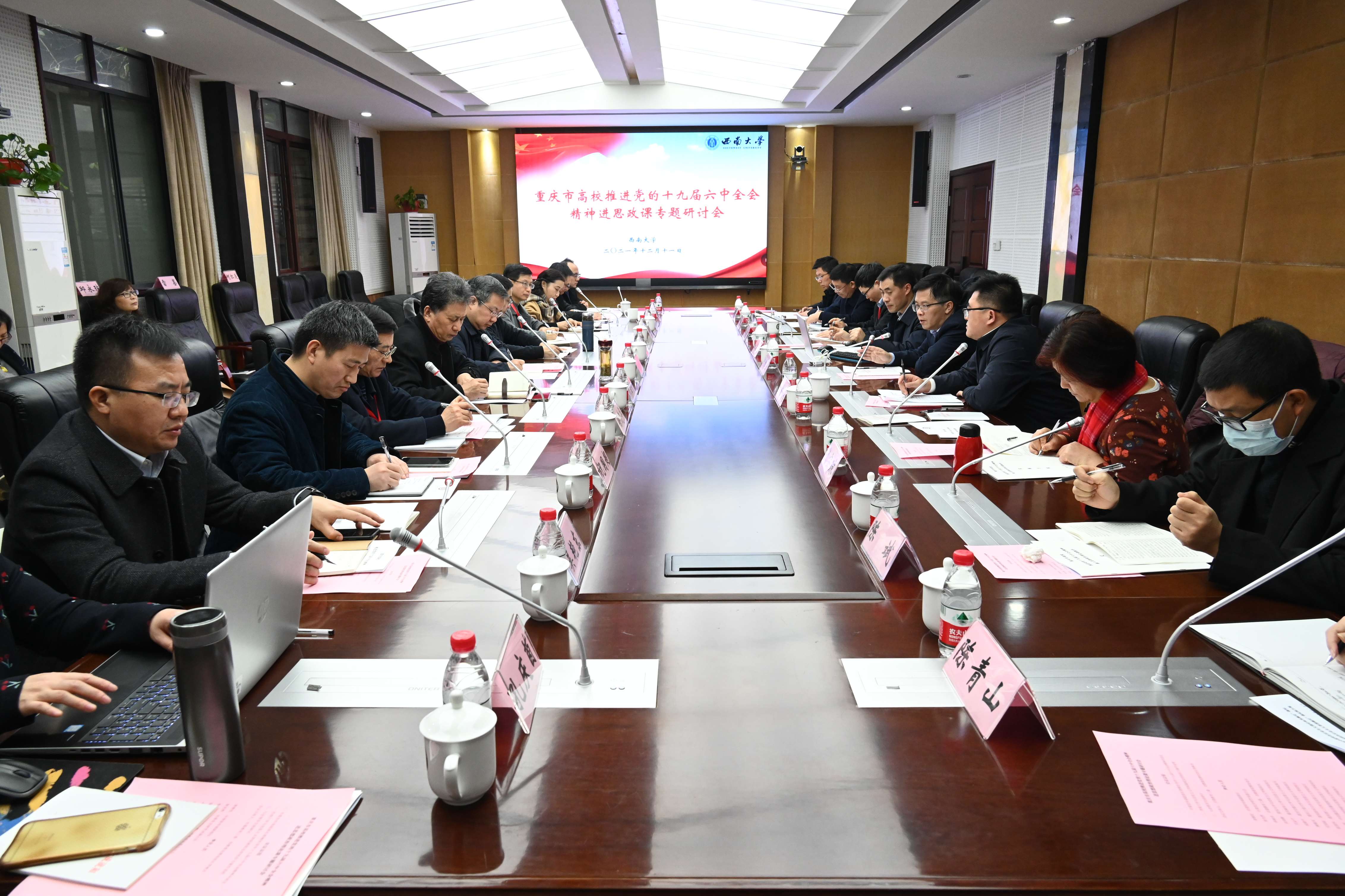 12月11日上午,重庆市高校推进党的十九届六中全会精神进思想政治理论课专题研讨会在学校马克思主义学院举行。市委宣传部副部长曾维伦,市委教育工委、市教委宣教处处长李林齐出席研讨会。重庆大学、taptap点点官方网站、重庆市委党校、西南政法大学、四川外国语大学、重庆师范大学、重庆邮电大学、重庆交通大学、重庆工商大学、重庆医科大学、重庆理工大学、四川美术学院、重庆科技学院、长江师范学院、重庆三峡学院、重庆第二师范学院、重庆城市管理职业学院17所高校马克思主义学院主要领导参加此次研讨,研讨会由李林齐主持。