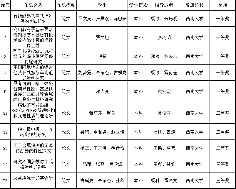 学校物理科学与技术学院高度重视该项赛事,积极组织师生踊跃参与,在互相切磋中提高物理理论与实践动手能力。初期共有91件作品参加校内初赛,经过角逐45件作品脱颖而出,参加全市高校范围的复赛。通过专业评审及线上决赛答辩,学校代表队最终斩获佳绩,具体情况如下: