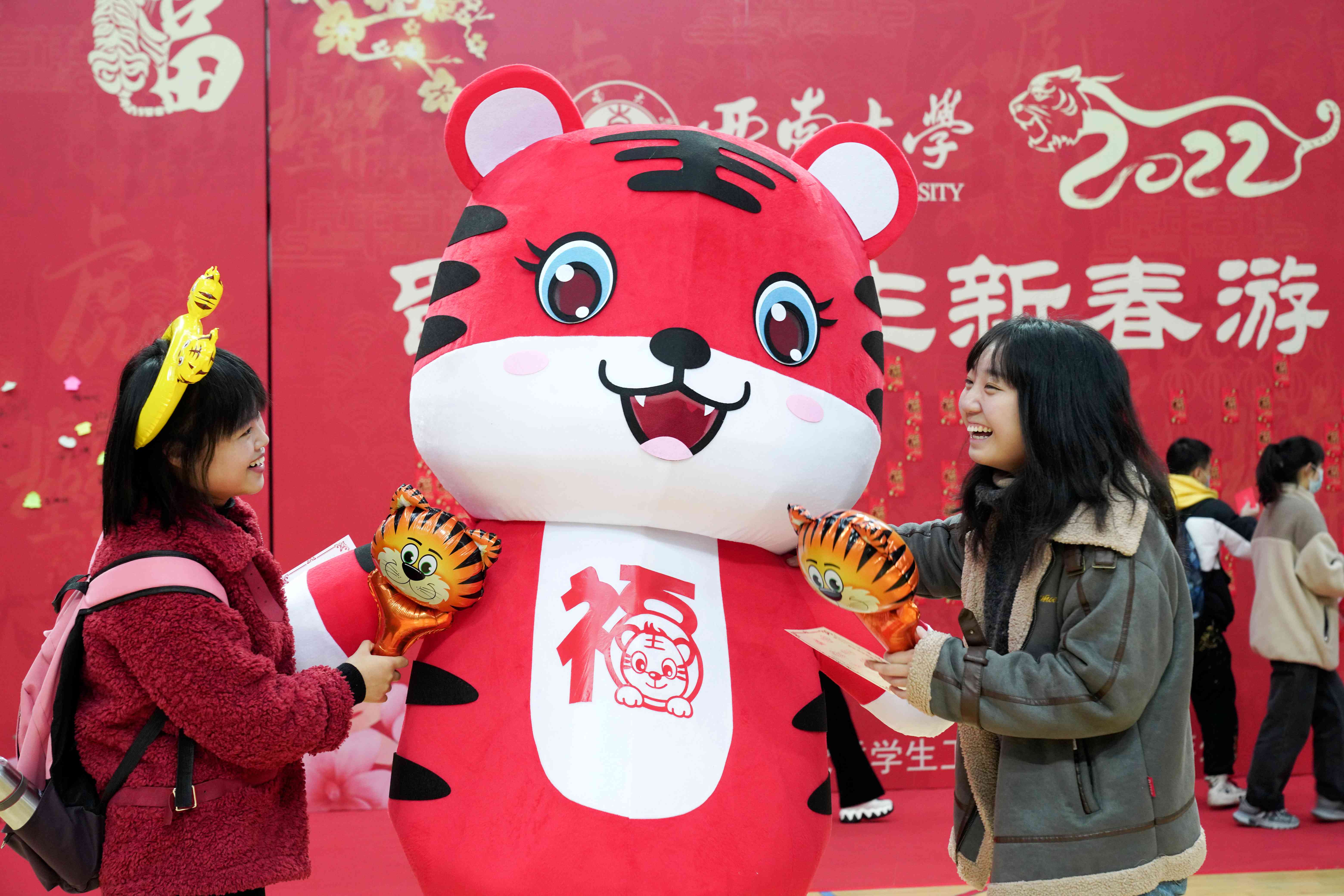 在游园会现场高达4米的心愿墙上,同学们纷纷写下2022年美好祝福或心愿拍照打卡,将美好祝福送给祖国,送给家乡亲友,也激励自己虎年虎虎生威,更上层楼。“祝疫情早日完全散去,祝老师同学们虎年大吉,祝祖国更加繁荣昌盛!”来自文学院2020级汉语言文学专业的香港籍同学何映霖讲到:“受疫情影响,今年是我第二次在学校过年,虽然连续两年都没能回家和家人团聚,但西大也是我的家,和老师、同学们一起过年,这里也有家的温暖。”