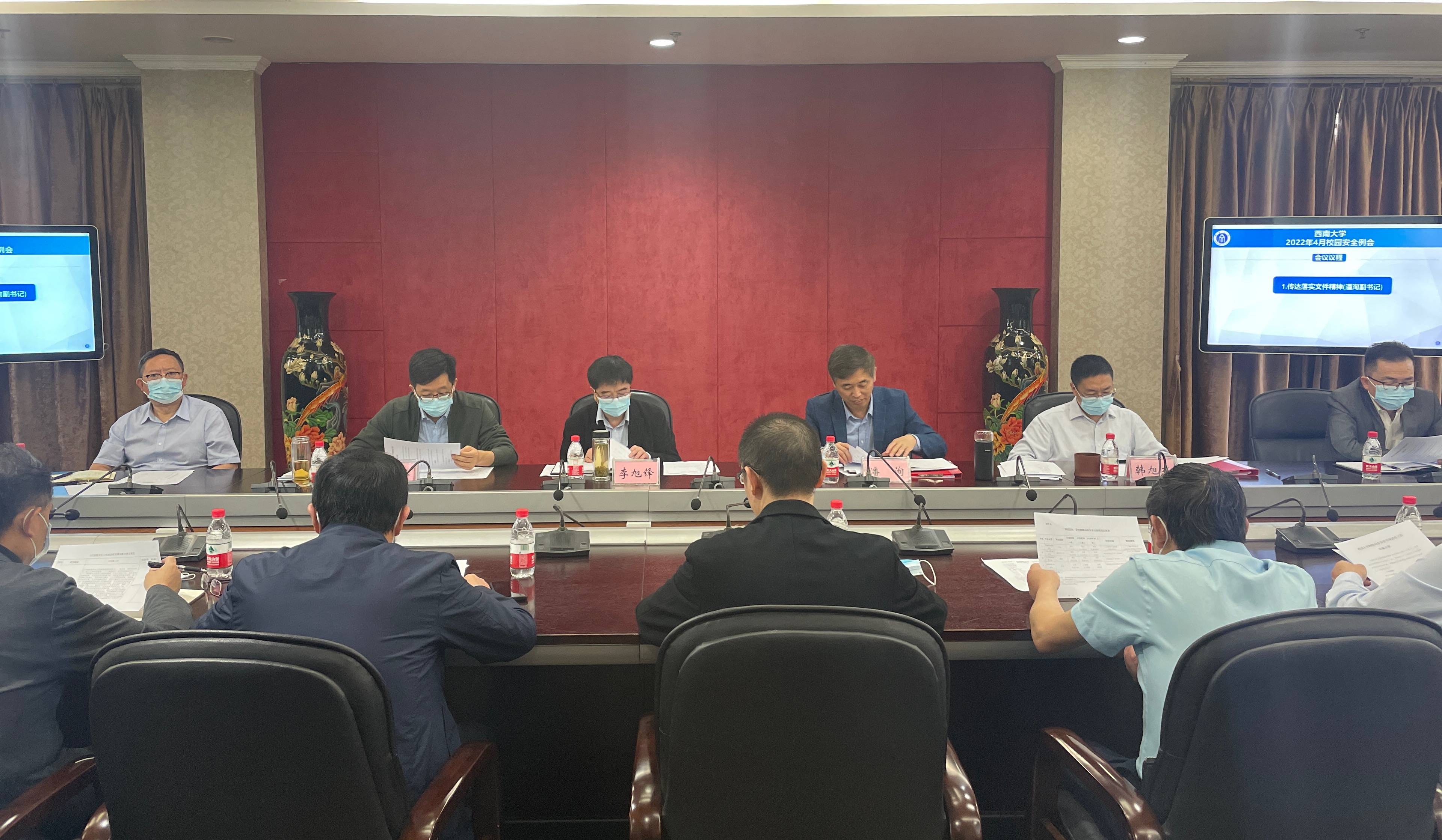 4月28日上午,学校4月校园安全工作例会在行署楼第五会议室召开。学校党委书记李旭锋,党委副书记潘洵,副校长赵国华、韩旭东出席会议,相关职能部门负责人参加会议。李旭锋主持会议。