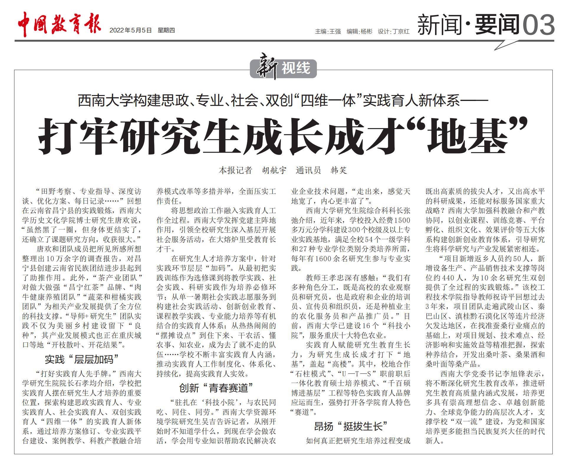 5月5日,《中国教育报》3版头条以“taptap点点官方网站构建思政、专业、社会、双创“四维一体”实践育人新体系——打牢研究生成长成才‘地基’”为题报道学校研究生实践育人工作,报道原文如下: