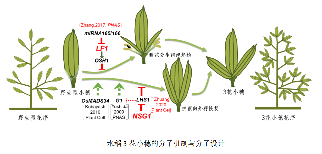 “高产、高产、再高产!”这是袁隆平先生提出的创新思路,也是水稻科技工作者坚持的目标。该团队大胆提出了一个全新的大幅度提高产量的策略——水稻“多花小穗”。每穗粒数是水稻产量构成三要素之一,主要通过改良枝梗性状来提升,然而目前已到达极限,需要寻找新的突破途径。禾本科作物小穗内小花的数目也是影响每穗粒数形成的重要因素,现有栽培水稻小穗内只包含一个可育小花/籽粒。实际上水稻小穗的两个护颖可能是由两个侧生小花退化而来,原始水稻小穗可能由三个小花构成。何光华教授带领团队解析了LF1起始小穗侧生小花的分子机制,证实了水稻是一个“3花小穗”,明确了一个水稻小穗可以同时结3个籽粒的科学基础;进一步分离了NSG1基因,揭示了该基因通过抑制LHS1来维持护颖(侧花)特征发育的分子机制,明确了通过组合设计LF1、NSG1和LHS1基因实现有育种价值的“3花小穗”的科学基础。首次提出的通过培育“3花小穗”品种大幅提高每穗粒数的高产新途径,受到广泛关注。