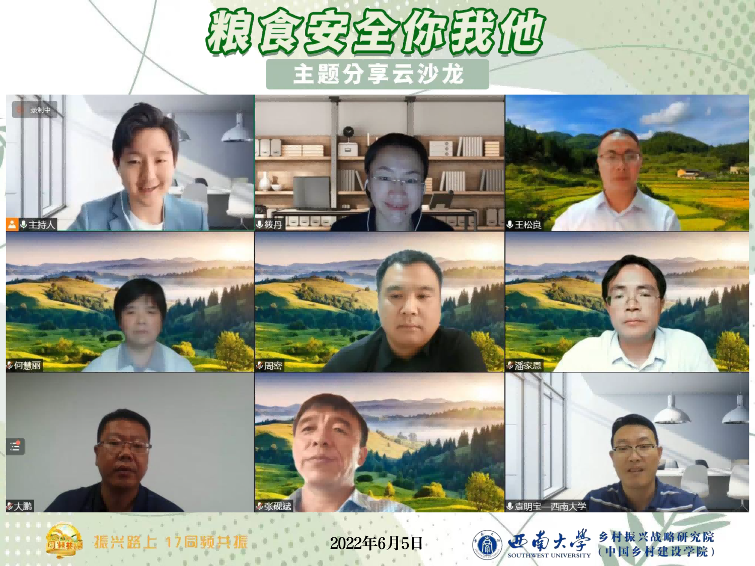 民以食为天,食以粮为本。6月5日,由学校乡村振兴战略研究院(中国乡村建设学院)与中央广播电视总台农业农村节目中心专题节目部联合主办的乡村振兴系列主题分享沙龙——“粮食安全你我他”在线举办,来自全国各地的8位一线实践者和专家学者相聚云端,共同探讨确保粮食安全的创新路径。