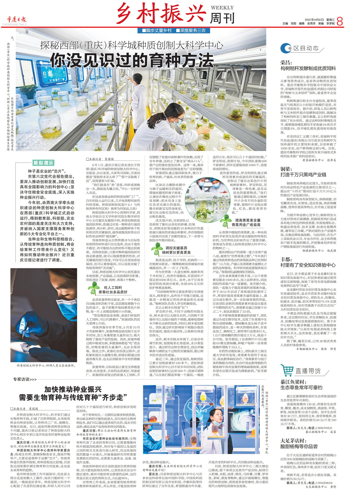 为国育种立新功,乡村振兴见行动。自今年初,学校牵头组织建设的种质创制大科学中心在西部(重庆)科学城正式启动运行起,学校在教育部、科技部、农业农村部的大力支持下,大力增强种业和生物科技结合力度,争分夺秒投身科研创新,致力育种攻关和种业振兴。6月8日,《重庆日报》8版乡村振兴周刊近整版报道了学校种质创制大科学中心科研团队奋力打好种业翻身仗的举措成效,题为《探秘西部(重庆)科学城种质创制大科学中心 你没见识过的育种方法》。同时,记者还专访了首席科学家夏庆友教授。全文报道如下: