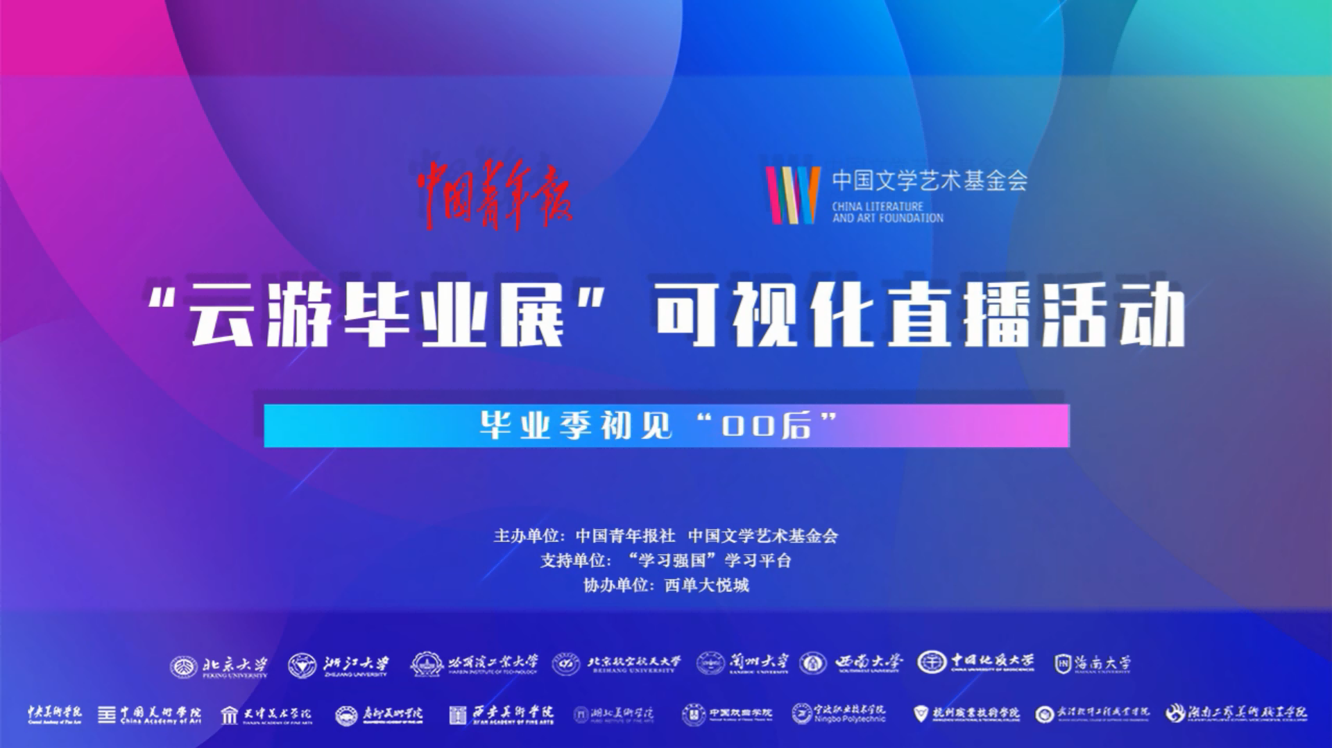 据悉,“毕业季初见‘00后’‘云游毕业展’可视化直播活动”由中国青年报社与中国文学艺术基金会共同主办,“学习强国”学习平台提供平台支持,多家高校共同承办。在云展厅的直播中,除学校作品外,观众还可以云上参观清华大学、北京大学、南开大学、浙江大学、兰州大学、中央美术学院、西安美术学院、中国戏曲学院、宁波职业技术学院等20余所院校的毕业设计作品,作品涵盖乡村振兴、艺术美学、传统文化与国潮、科研创新设计等诸多主题,充分展示了00后对艺术的理解、对社会的观察,以及对创新的探索。