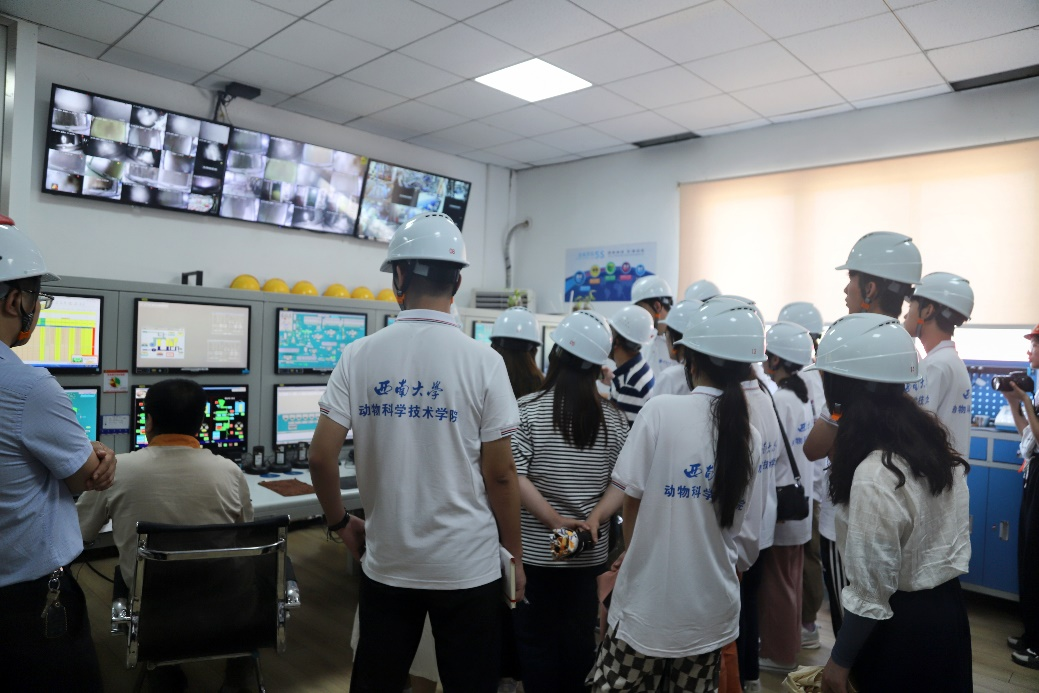 在双胞胎集团荣昌饲料厂,实践团依次参观了原料库、中控室、制粒区、成品库等生产加工区域,了解病菌消杀、环境控制、原料进出、生产加工和包装存储等一系列生产流程,亲身体验饲料生产的现代化和智能化生产模式。成员们还前往重庆正大集团下属的潼南正垣垚养猪场和铜梁二坪种猪场,亲身感受生猪养殖产业的智慧化和科技化。实践团成员汪乐淙十分感慨:“这些现代生猪养殖场,从厂区规划、圈舍环境、日常饲养、温控调节、粪污处理和动物福利等方面,无不体现着高科技和智能化。”