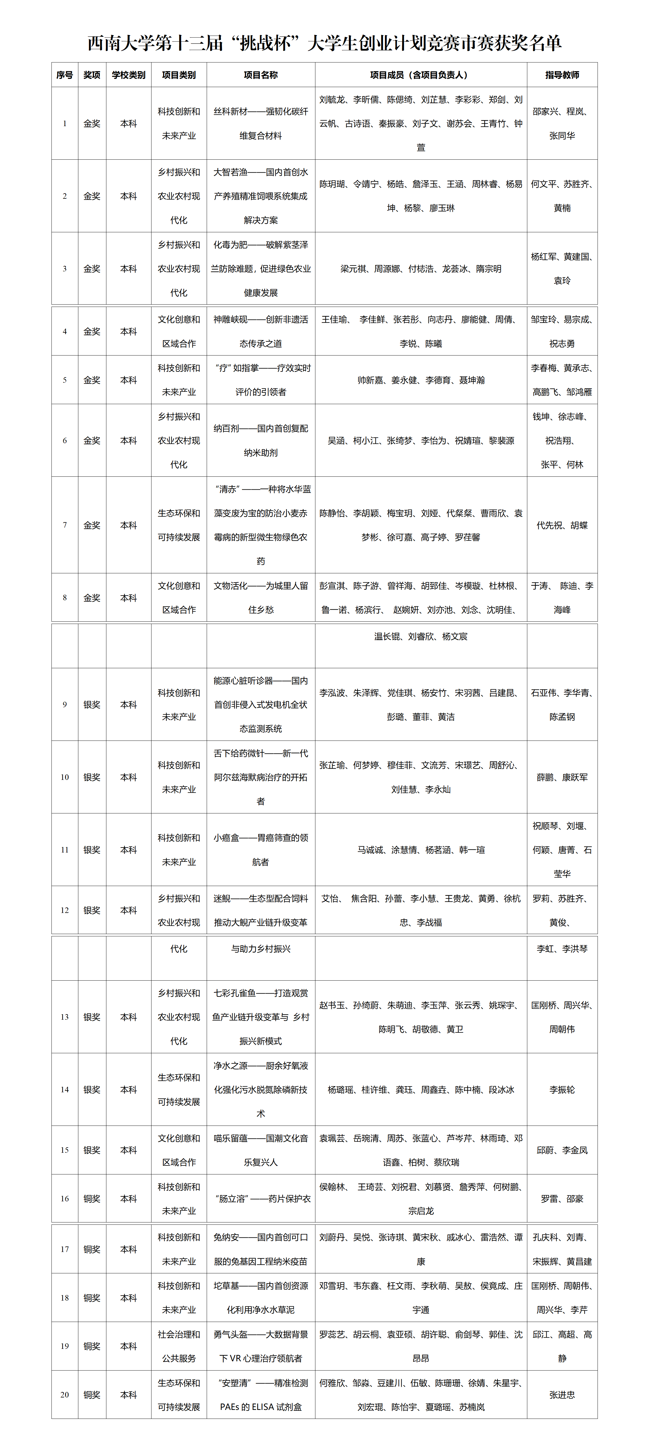 本次市赛共有重庆市80所高校推荐的942件作品入围市赛决赛,涵盖科技创新和未来产业、乡村振兴和农业农村现代化、社会治理和公共服务、生态环保和可持续发展、文化创意和区域合作等5个类别。经过激烈的角逐,学校学子在此次比赛中斩获8项金奖、7项银奖,5项铜奖,其中4个项目成功入围全国赛,26位教师被评为优秀指导教师,学校荣获优秀组织奖。