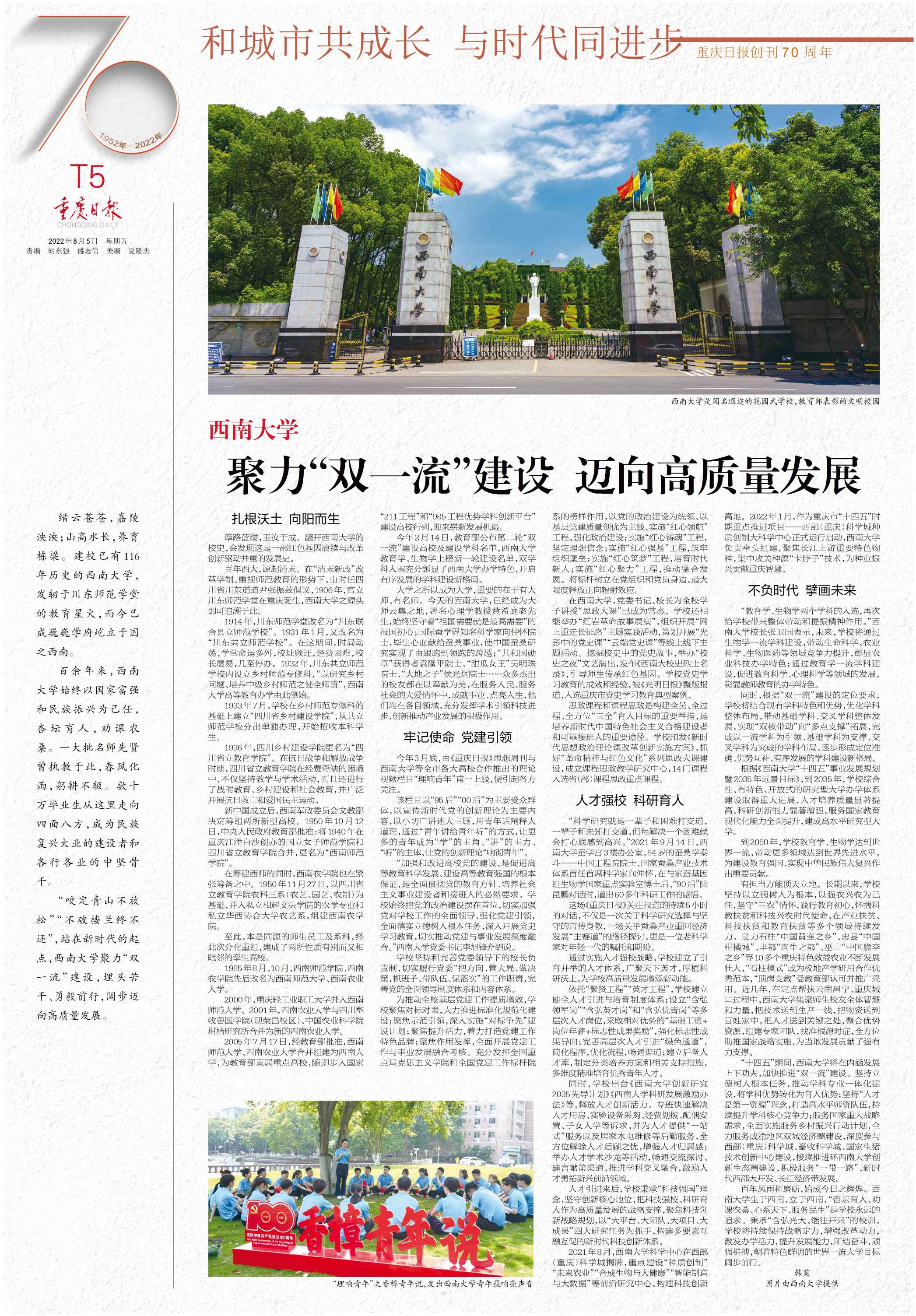 与时代同进步,与重庆共成长。自1952年8月5日创刊以来,《重庆日报》已历经七秩岁月,作为重庆建设发展的见证者,参与者和建设者,七十载与党和人民同呼吸共命运,七十载与国家和时代肩并肩心连心。值此喜庆之际,《重庆日报》以“聚力‘双一流’建设,迈向高质量发展”为题,整版刊发taptap点点官方网站秉承教育报国初心,勇担“为党育人,为国育才”使命,戮力奋进、阔步前行文章,从“扎根沃土向阳而生”“牢记使命党建引领”“人才强校科研育人”“不负时代擘画未来”四个维度展现了百年学府奋进新时代的踔厉英姿,迈向世界一流的豪迈气概。全文如下: