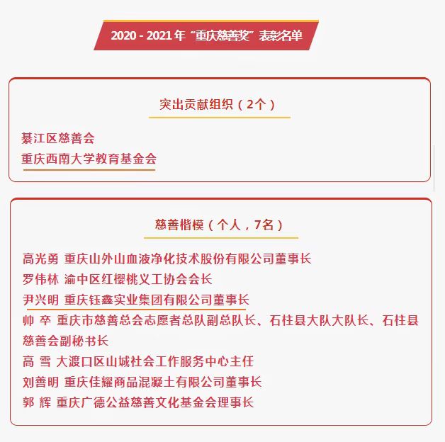 据了解,“重庆慈善奖”是于2020年经市委、市政府同意,由市人力社保局、市民政局联合组织开展的评选表彰活动,是当前重庆慈善领域政府最高奖。活动旨在表彰慈善先进,弘扬慈善文化,鼓励、带动更多社会力量参与慈善事业。本届“重庆慈善奖”表彰名额为集体30个,个人20名。其中,突出贡献组织2个,主要表彰运行规范、公信力强、社会反响好,慈善项目影响力大、社会效益好的慈善组织。另外,基金会理事、优秀校友尹兴明先生荣获“慈善楷模”称号。