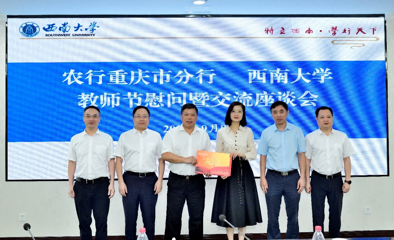 9月8日上午,中国农业银行股份有限公司重庆市分行(以下简称“农行重庆分行”)党委书记朱晔一行来校开展教师节慰问,校长张卫国、党委副书记潘洵出席活动,相关职能部门负责人列席。活动由潘洵主持。