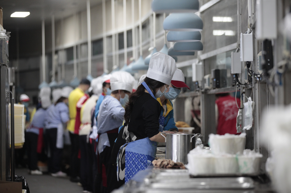 “患难与共定守望相助”是后勤集团一直的做法。近期膳食服务中心工作强度最大,每天凌晨3点半开工,晚上22点收工,平均每天供应13万人次的盒饭,任务重、时间紧、人手不足。各个中心在保证本职工作的前提下,纷纷伸出援手。女职工们到各食堂打包、发放盒饭,男职工们到后厨搬运、切菜、淘洗,值班员、绿化工、维修工都干起了“伙食军”。绿化工邓礼双、庞弟平等5人,一个下午搬运了15吨面粉,腰酸背痛,只为早点收工,第二天一早还要清扫校园。