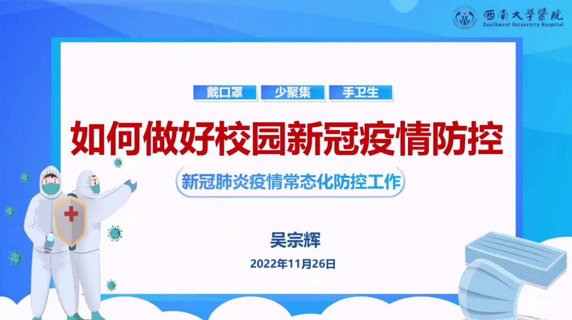 为精准回应学校师生关切问题,推动广大师生同舟共济、守望相助、同心抗疫,学校推出“同心战疫”系列讲座,用好战疫“活教材”,打好抗疫“保卫战”。校医院党委书记、院长吴宗辉11月26日受邀为全校师生带来《如何做好校园新冠疫情防控》线上专题讲座。