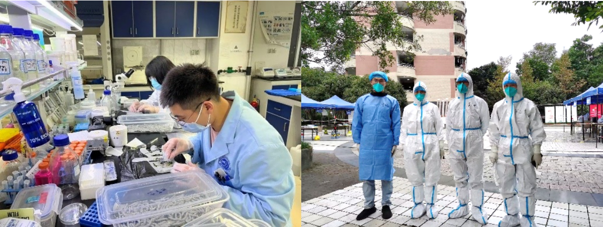 在黄树村,数名博士后争当志愿先锋,临时管控期间,在南社区活动中心临时住宿、睡行军床,早起晚休甚至带病坚持,协同开展信息摸排、组织核检、应急处置、生活保障等工作,有的老师连夜在黄树村22栋、23栋进行消杀和垃圾清理等工作,穿着防护服工作到满身汗水。