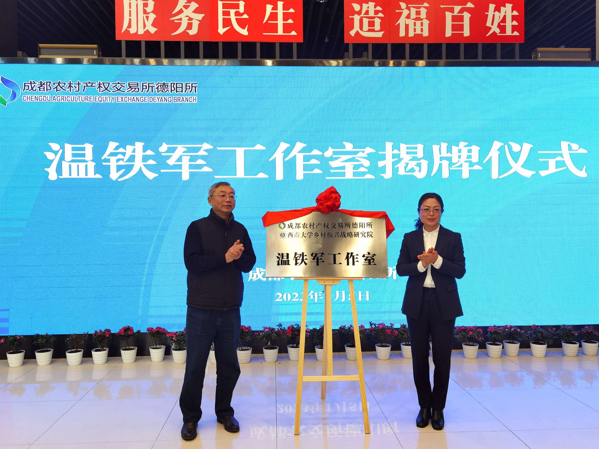 为助力成渝地区双城经济圈乡村振兴,推动农村产权交易市场协同建设,助推校企共建与地方服务,1月5日上午,学校乡村振兴战略研究院与成都农村产权交易所德阳分所合作共建的“温铁军工作室”揭牌仪式在四川德阳举办。研究院首席专家温铁军教授作视频讲话,研究院执行院长肖亚成与德阳农交所总经理谢玉萍共同为“温铁军工作室”揭牌。重庆市武隆区委副书记毛大春、德阳市农业农村局总畜牧师吴迪等一起见证揭牌。