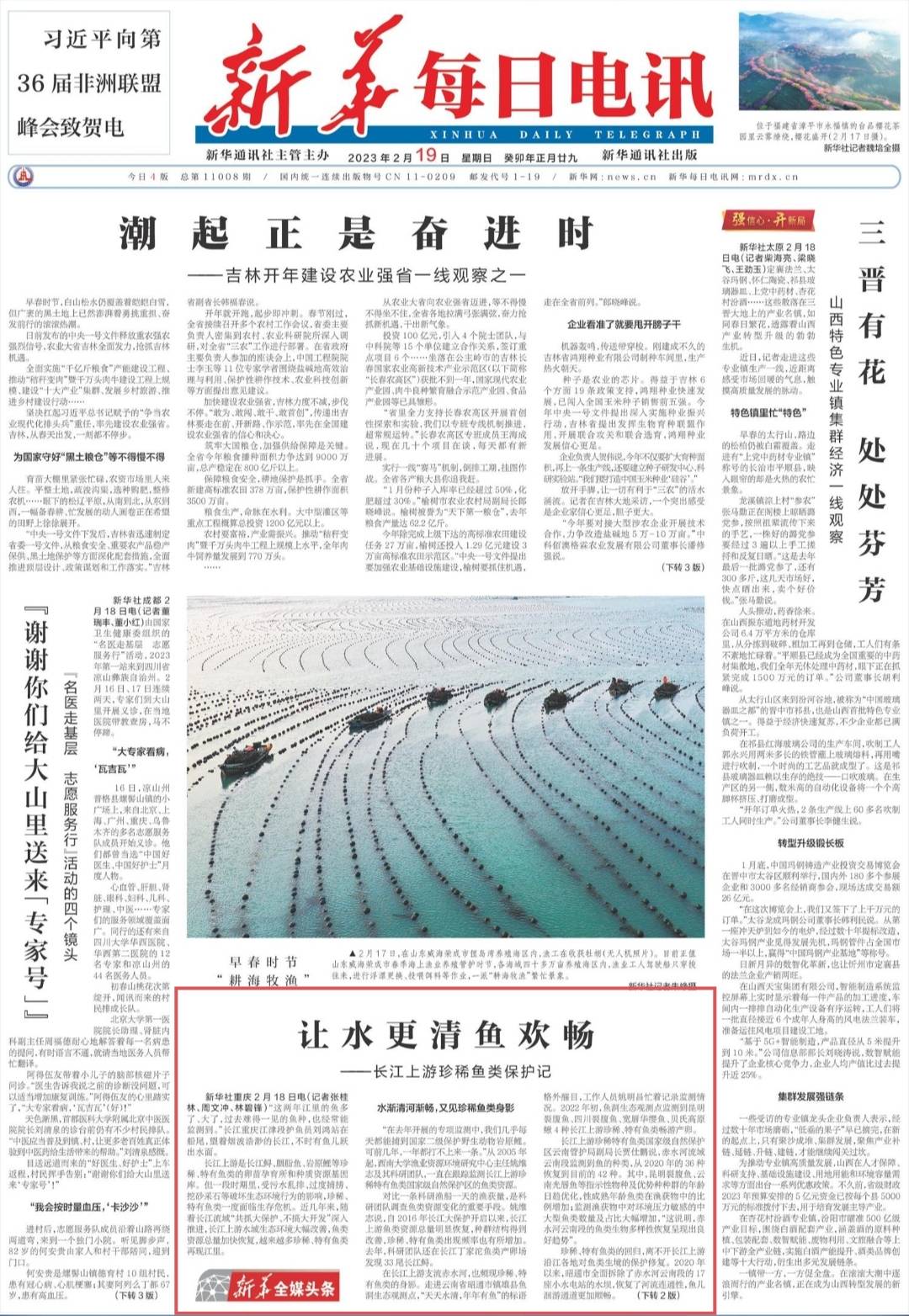 2月18日,新华社《新华每日电讯》头版刊发文章《让水更清鱼欢畅——长江上游珍稀鱼类保护记》,报道学校水产学院姚维志教授及其科研团队保护长江上游珍稀特有鱼类资源的科研育人事迹。