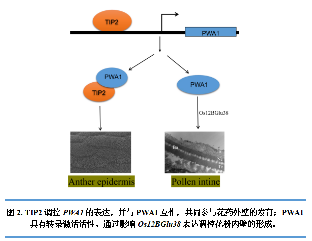 2022年9月16日,Plant Physiology(IF2021=8.005) 在线发表了学校水稻研究所的题为“POLLEN WALL ABORTION 1 对水稻花粉壁发育至关重要”(POLLEN WALL ABORTION 1is essential for pollen wall development in rice)的最新研究成果。该研究通过对一个雄性不育突变体pwa1(pollen wall abortion 1)的研究,发现突变体的花粉内壁缺失,花粉外壁柱状层缺失导致外壁外层和外壁内层融合,最终导致花粉填充失败,完全不育。PWA1编码一个保守的含有CC结构域的表达蛋白,定位于细胞核,在花药的绒毡层和小孢子中均有表达。研究发现,PWA1与花药发育重要转录因子TIP2依赖CC结构域存在互作关系,TIP2直接结合PWA1的启动子调控PWA1的表达,且进一步通过构建双突变体证明了TIP2位于PWA1的上游。研究还发现PWA1具有转录激活活性,并可能通过直接激活花粉内壁形成关键基因Os12BGlu38的表达而参与对花粉内壁的调控(图2)。该研究拓展了水稻花药外壁与花粉壁的发育调控途径。