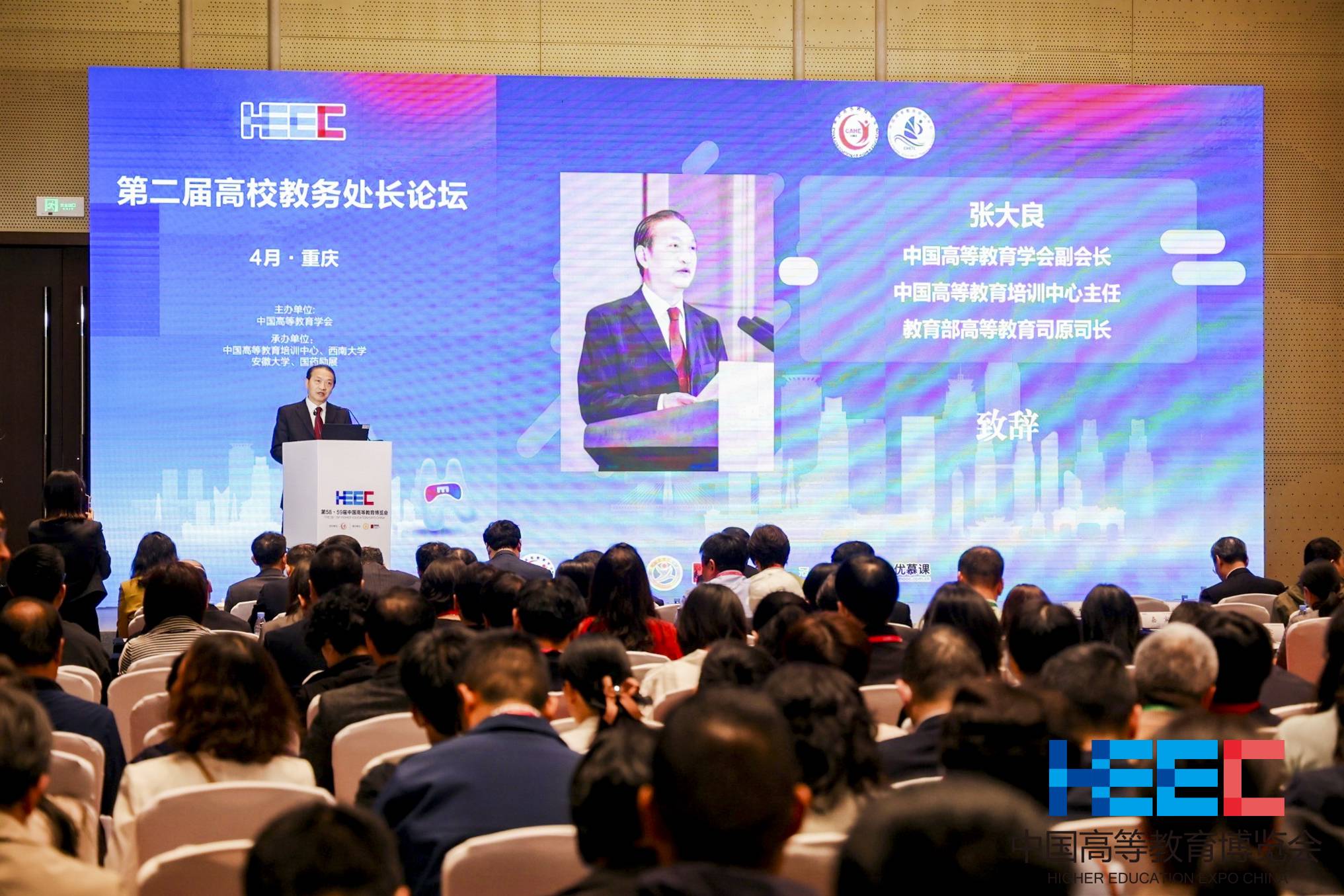 4月10日,第58•59届中国高等教育博览会第二届高校教务处长论坛在重庆悦来国际会议中心成功举办,本次论坛由学校与中国高等教育培训中心等单位联合承办。中国高等教育学会副会长、中国高等教育培训中心主任张大良,重庆市高等教育学会会长严欣平,学校党委副书记安春元出席论坛并致辞。来自全国高校校领导、教务处长等共计200余人参会。