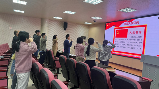 面对鲜红的党旗,恰逢政治生日的汪玉林和杨集梅作为领誓人带领支部党员郑重宣誓,重温入党誓词。