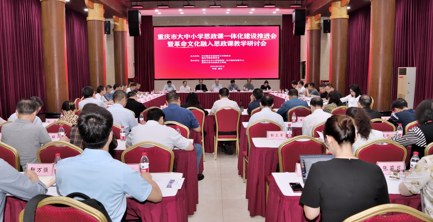为深入学习贯彻党的二十大精神,落实习近平总书记关于思政课建设的重要指示,不断提升重庆市思政课教育教学质量和育人水平,统筹推进大中小学思政课一体化建设,5月5日上午,由中共重庆市委教育工作委员会、重庆市教育委员会主办,重庆市大中小学思政课一体化建设创新中心、学校马克思主义学院承办的重庆市大中小学思政课一体化建设推进会在学校东方红会议厅召开,来自国家教材委员会,全国部分高校马克思主义学院,四川省教育厅,重庆市各级教委、教科院、教育评估院以及川渝部分大中小学等近80名领导、专家、名师参加会议。会议由重庆市教委宣教处处长李林齐主持,随后的主题报告由学校党委副书记潘洵主持。