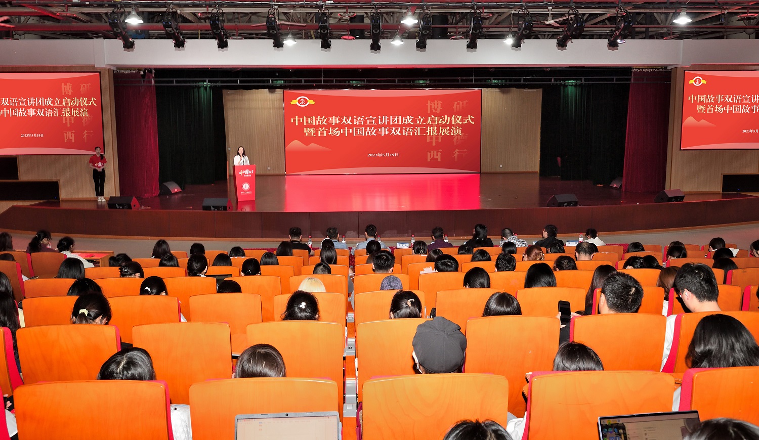 5月19日下午,外国语学院中国故事双语宣讲团成立启动仪式暨首场中国故事双语汇报展演在taptap点点官方网站圆顶报告厅举行。taptap点点官方网站党委常委、党委组织部部长李荣华,党委宣传部、外国语学院相关领导和师生代表,中国故事双语宣讲团指导教师代表及全体成员到场参加。